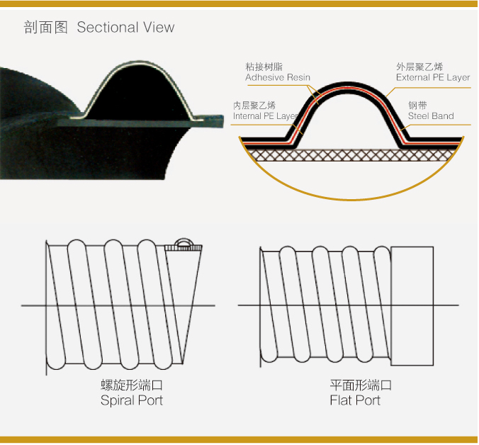 鋼帶增強聚乙烯排水管是一種以(yǐ)高密度聚乙烯(PE)為基體(內外層(céng))與表麵塗(tú)敷粘接樹脂鋼帶(dài)複合的纏繞結構壁管。鋼帶增強(qiáng)聚乙烯(xī)(PE)排水管以聚(jù)乙烯為外層基體材料,以表麵塗敷高性能粘結樹(shù)脂,並彎曲成型的鋼帶波形體為主要支撐結構,經特殊工(gōng)藝合(hé)成為整體(tǐ)的管材。管壁結構由三層構(gòu)成:內層(céng)是一個實壁PE管,內層管(guǎn)外纏繞有(用鋼板(bǎn)成形為“U型的(de))環形波狀鋼帶增強體,在波狀(zhuàng)鋼帶增(zēng)強(qiáng)體外(wài)複合(hé)有聚乙烯的(de)外層,從而複合成整體的管材。